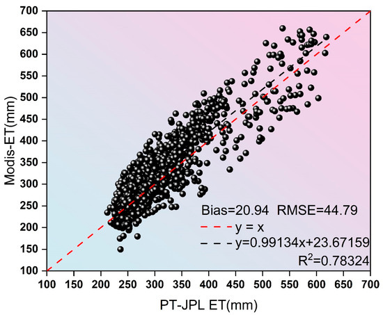 Furthermore, our research compared the annual ET simulated by the PT-JPL model with the annual ET from the MODIS product. The validation results indicated an R2 value of 0.78, a Bias of 20.94 (Figure 5), and an RMSE of 44.79. The comparison between the annual average ET values from the PT-JPL model and those from the MODIS product demonstrates that the model’s simulation results are highly reliable.