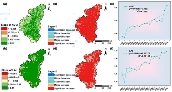 The interannual variation trends in NDVI and LAI in the HLS from 2000 to 2018. (a,b) The temporal and spatial variation trend in NDVI and LAI from 2000 to 2018. (c,d) The significance of the changes in NDVI and LAI from 2000 to 2018. (e,f) The average annual sequence values of NDVI and LAI from 2000 to 2018.