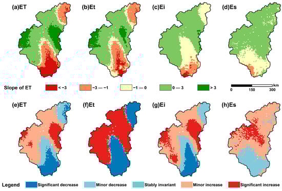 Slope of ET (a), Et (b), Ei (c), and Es (d) and the significance test of the slope of ET (e), Et (f), Ei (g), and Es (h) in the HLS from 2000 to 2018 under the vegetation change scenario simulated by PT-JPL.