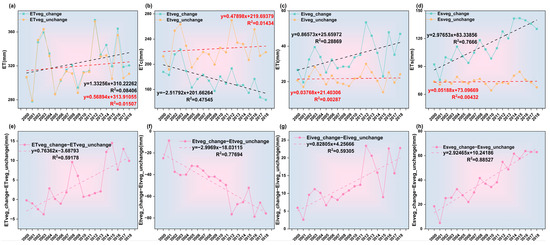 Effect of vegetation greening on the HLS ET. (a–d) The green line represents the regional mean annual values for actual ET, the orange line represents the regional mean annual values of ET for the vegetation-neutral scenario, and the dashed line represents their trends. (e–h) Difference between the annual values of ET for the vegetation-variable and vegetation-invariable scenarios, with the dashed line indicating their trends.