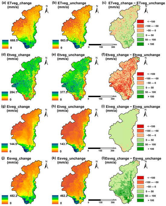 (a,b,d,e,g,h,j,k) The average annual ET (Et, Ei, Es) in the HLS from 2000 to 2018 under the two scenarios. (c,f,i,l) The difference between ET and its components in the two situations in the HLS from 2000 to 2018.