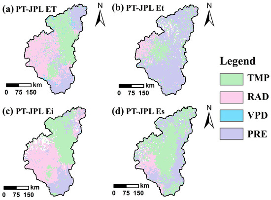 (a) Spatial patterns of ET’s dominant factors. (b) Spatial patterns of Et’s dominant factors. (c) Spatial patterns of Ei’s dominant factors. (d) Spatial patterns of Es’s dominant factors.