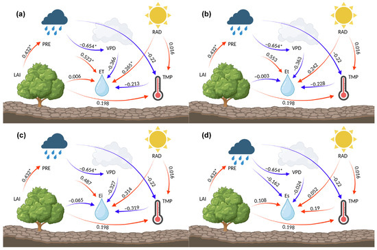 Analysis of direct and indirect effects of climate and vegetation conditions on (a) ET, (b) Et, (c) Ei, (d) Es. * p < 0.05.