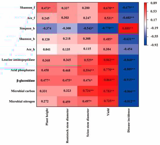 3.8. Correlation Analysis Between Growth Traits, Disease Resistance, Soil Microbial Biomass, Microbial Diversity, and Soil Enzyme Activity in Grafted Eggplants