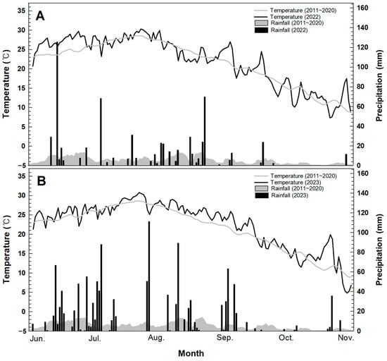 The experiment was tested in an experimental upland field converted from a paddy in Orye-ri, Bubuk-myeon, Miryang-si, Gyeongsangnam-do (35°29′32.3″ N, 128°44′31.0″ E) for two cropping seasons from 2022 to 2023. The average temperature and precipitation in the main growing periods (from June to November) are shown in