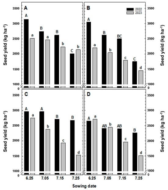 41], which demonstrated that late sowing often results in reduced accumulated temperature due to the shorter maturity period, ultimately affecting the yield potential. In these studies, a longer accumulated temperature during the growing season was associated with an improved seed yield, as the plants had more time to develop critical reproductive structures.