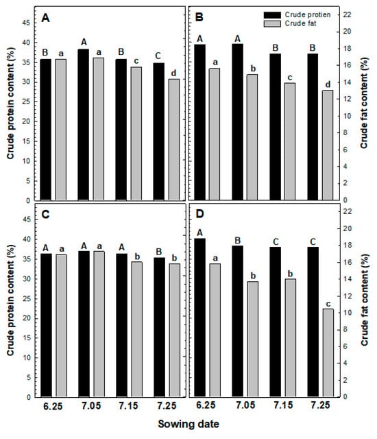 39] in mung beans, who also observed a decline in fat content with later sowing. However, in the present study, both protein and fat contents decreased with later sowing, which could be attributed to environmental stressors such as high humidity and lower temperatures during the critical seed-filling stage. Jung et al. [