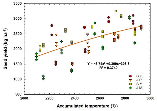 Figure 4. The coefficient of determination (r²) for this correlation was 0.3749, indicating a moderate positive relationship between accumulated temperature and yield. As the sowing season advanced, the accumulated temperature gradually decreased, which significantly affected the soybean yield. This finding is consistent with previous studies, such as those by Kumudini [