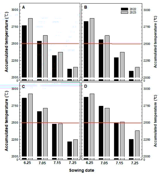 Figure 5. A distinct decrease in accumulated temperature was observed as the sowing date was delayed. For example, in 2022, the accumulated temperature for Seonyu 2 decreased by 23.3% in the 25 July sowing plots, with 2125 °C recorded for the late-sown Jangpung cultivar compared to 2769 °C in the 25 June sowing plots. Similarly, in 2023, the accumulated temperature for Jangpung decreased by 25.2% in the 25 July sowing plots (2152 °C) compared to the 25 June sowing plots (2877 °C). The reduction in accumulated temperature had a direct effect on yield, as varieties such as Jungmo 3015, Seonpung, and Jangpung exhibited the largest decreases in annual average yields, with reductions of 25.6%, 22.9%, and 20.3%, respectively, in the 25 July sowing plots. These varieties faced a shortened growing season, which likely reduced the time available for effective photosynthesis, assimilate production, and grain filling, thus reducing overall productivity. Research by Chen [
