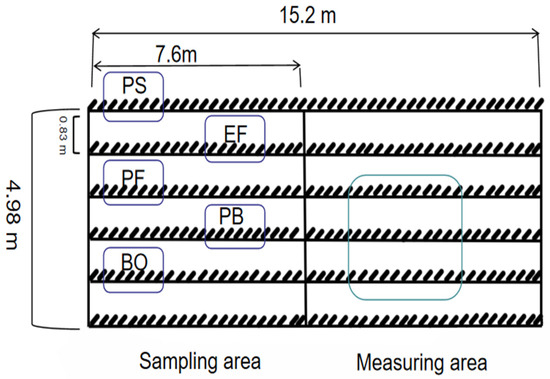 Sampling and Measuring Plot diagram. Note: PS represents peak squaring period, EF represents early flowering period, PF represents the peak flowering period, PB presents the peak bolling period. BO represent boll opening period. The dark blue boxes represent areas where biomass was sampled during that period. The light blue boxes represent areas where yields were measured.