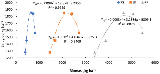 The relationship between lint yield and population biomass for growth period of PS, EF and PF. Y stand for lint yield, X stand for biomass. PS, EF and PF are abbreviation for peak squaring period, early flowering period and peak flowering respectively.
