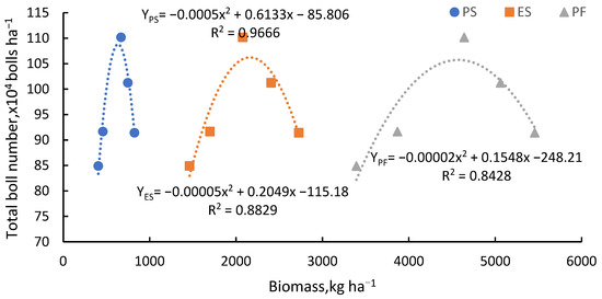 Relationship between population total boll number and biomass for growth period of PS, ES and PF. Y stand for total boll number, X stand for biomass. PS, EF and PF are abbreviation of peak squaring period, early flowering period and peak flowering period respectively.