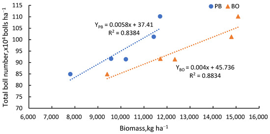 Relationship between population total boll number and biomass for growth period of PB, and BO respectively. Y stand for total boll number, X stand for biomass. PB and BO are abbreviation of peak bolling period and boll opening period respectively.