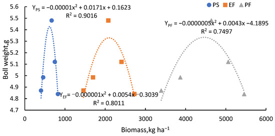 Relationship between population boll weight and biomass for growth period of PS, EF and PF. Y stand for boll weight, X stand for biomass. PS, EF and PF are abbreviation of peak squaring period, early flowering period and peak flowering period respectively.