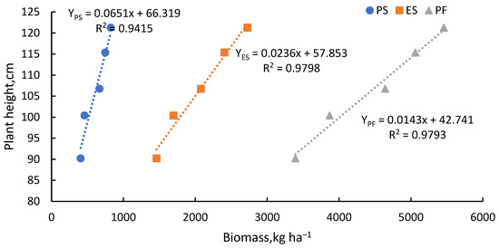 Relationship between plant height and biomass for growth period of PS, ES and PF. Y stand for plant height, X stand for PB. PS, EF and PF are abbreviation of peak squring period, early flowering period and peak flowering period respectively.