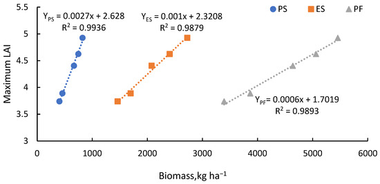 Relationship between maximum LAI and PB for growth period of PS, ES and PF. Y stand for maximum LAI, X stand for biomass. PS, EF and PF are abbreviation of peak squaring period, early flowering period and peak flowering period respectively.