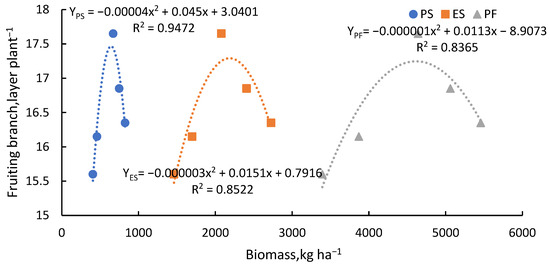 The fruit branch number first increased and then decreased with a reduced planting density. The highest fruit branch number was observed for treatment D3 (Table 2). The quadratic regression analysis showed that the maximum fruit branch number could be achieved at a moderate biomass for the peak squaring, early flowering, and peak flowering periods (Figure 9), and no remarkable quadratic relationship was observed between the number of fruit branches and biomass in the peak boll setting and boll opening periods (p > 0.05). These results indicate that the formation of fruit branches depends on biomass accumulation before the peak flowering period, and biomass accumulation after this stage has little effect on the development of fruit branches.