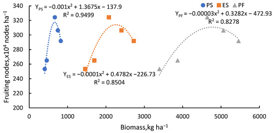 The population fruit nodes first increased and then decreased with a reduced planting density. The largest population fruit nodes were observed for treatment D3 (Table 2). The quadratic regression analysis indicated that the maximum population of fruit nodes could be obtained at an appropriate biomass before the peak flowering stage (Figure 10). The biomass values were 683.8, 2391.0, and 5470.0 kg ha−1 in the peak squaring, early flowering, and peak flowering periods, respectively. However, there were significantly positive linear correlations between population fruit node number and biomass in the peak boll setting and boll opening periods (Figure 11). These results show that the optimum PB before peak flowering benefits the formation of fruit nodes. The higher the biomass after the peak flowering stage, the higher the population fruit node number.