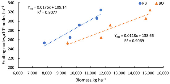 Relationship between fruit node number and biomass for growth period of PB and BO. Y stand for population node number, X stand for biomass. PB and BO are abbreviation of peak bolling period and boll opening period respectively.
