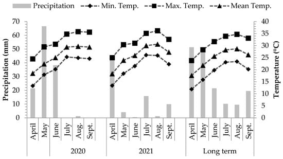 A typical Mediterranean climate prevails at the study site, where summers are hot and dry, and springs are temperate and rainy. The weather conditions during the two growing seasons (2020 and 2021) were consistent with a Mediterranean climate, characterized by hot, dry summers and moderate rainfall in the spring. Across both seasons, temperatures increased steadily from April to a peak in July and August, with minimal variation between the two years. Precipitation showed a clear pattern of concentration in the earlier months of the growing season, particularly in April and May, followed by a sharp decline during the summer months of June to September. This seasonal drought necessitated supplemental irrigation to maintain adequate soil moisture levels, particularly during July and August when rainfall was negligible. In comparison to long-term averages, the growing seasons followed the expected weather trends, though with some fluctuations in rainfall distribution (Figure 1).