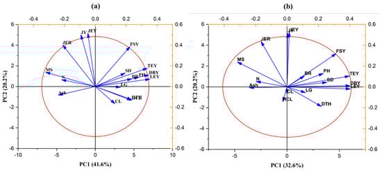 In 2021, a shift in the trait contributions was observed. PC1 and PC2 explained 32.6% and 20.2% of the variance, respectively, amounting to a cumulative variance of 52.8% (Figure 2). The traits that contributed heavily on PC1 included DBY, LEY, and TEY, like the previous year, reinforcing their importance in defining the primary dimensions of variation among the genotypes (Table 8). However, the alignment of JY and JEY continued to be significant with PC2, suggesting consistency in the underlying genetic and phenotypic traits influencing these variables.