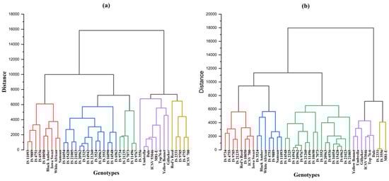 Cluster analysis (CA) was employed to categorize the sweet sorghum genotypes based on their performance across multiple biofuel-related traits. CA was selected for its ability to identify natural groupings among genotypes by maximizing within-cluster similarity and between-cluster differences. This approach is particularly suitable for high-dimensional data, as it effectively manages multiple agronomic and bioethanol production traits without requiring a prior reduction in trait numbers. Additionally, CA’s visual representation through dendrograms provides an intuitive understanding of genetic relationships, crucial for discerning clusters that align with specific biofuel potential or geographic origin. This analysis resulted in the identification of five distinct clusters for each year, with each cluster represented by different colors.