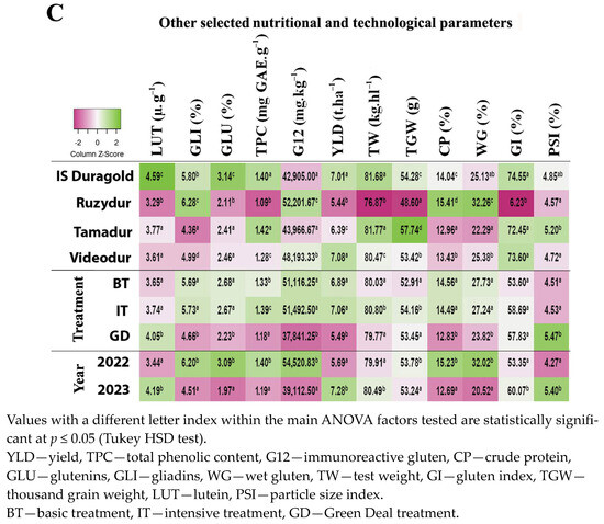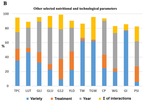 In comparison to PAAs, the overall relative variability (RSD) of other nutritional and technological parameters was significantly lower, with values not exceeding 31%. The only exception was the previously mentioned gluten index (GI), which exhibited RSD of 59% (Table 2). All the three factors (variety, year, and treatment) were found to be statistically significant for the majority of these parameters (Figure 2C). Additionally, the influence of the variety on the variability of these parameters was markedly more pronounced compared to PAAs. For instance, the percentage influence of the variety on thousand-grain weight (TGW) and test weight (TW) exceeded 60%, while for the gluten index (GI) it reached 76% (see Figure 3B).