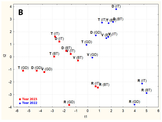 PCA score plots for tested combinations of durum wheat samples based on the variability of PAAs (A) and other parameters (B). BT—basic treatment, IT—intensive treatment, GD—Green Deal treatment, D—Duragold, R—Ruzydur, T—Tamadur, V—Videodur.