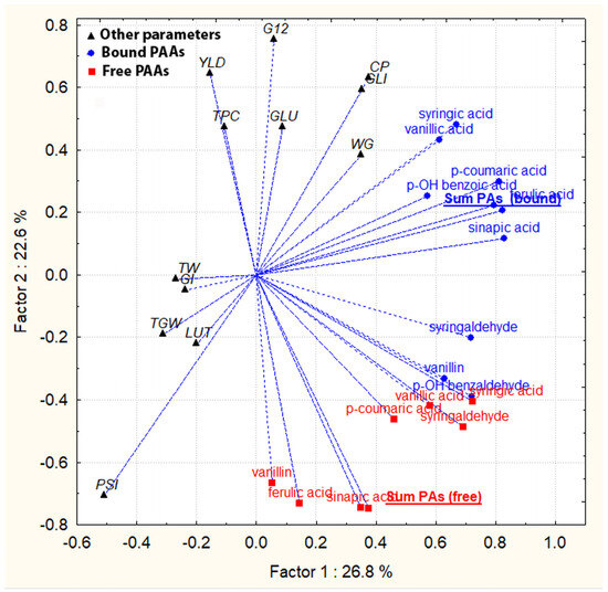 PCA plot of mutual relationships of variables (PAAs) with other chemical compositions of grains (annual Z-standardization). YLD—yield, TPC—total phenolic content, G12—immunoreactive gluten, CP—crude protein, GLU—glutenins, GLI—gliadins, WG—wet gluten, TW—test weight, GI—gluten index, TGW—thousand grain weight, LUT—lutein, PSI—particle size index.