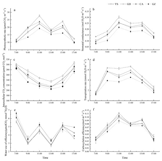 Dynamic variation of photosynthetic characteristics in four chestnut cultivars. The error bars indicate mean ± SD. (a): Photosynthetic rate (Pn, μmol CO2 m−2s−1); (b): Stomatal conductance (Gs, mol H2O m−2s−1); (c): Intercellular CO2 concentration (Ci, μmol CO2 mol−1); (d): Transpiration rate (Tr, mmol H2O m−2s−1); (e): Water use of efficiency (WUE = Pn/Tr, μmol CO2 mmol−1 H2O); (f): Carboxylation efficiency (Vc = Pn/Ci, mol m−2s−1).