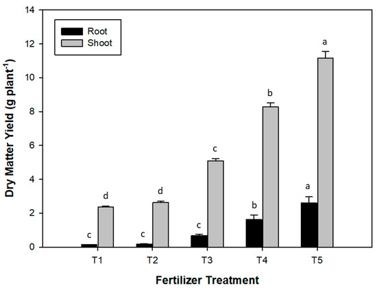 Effect of fertilizer treatments on dry matter yield of sunflower plants. Means with the same letter were not significantly different according to the Bonferroni test (p < 0.05). Error bars represent the standard error for each fertilizer treatment. T1, non-fertilized control; T2, 100% vivianite; T3, 70% vivianite + 30% superphosphate; T4, 30% vivianite + 70% superphosphate; T5, 100% superphosphate.