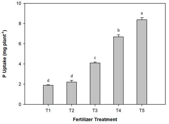 Effect of fertilizer treatments on P uptake of sunflower plants. Means with the same letter were not significantly different according to the Bonferroni test (p < 0.05). Error bars represent the standard error for each fertilizer treatment. T1, non-fertilized control; T2, 100% vivianite; T3, 70% vivianite + 30% superphosphate; T4, 30% vivianite + 70% superphosphate; T5, 100% superphosphate.