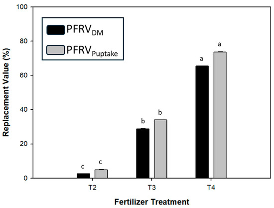 Effect of fertilizer treatments on PFRV on DM and P uptake basis for sunflower plants. Means with the same letter were not significantly different according to the Bonferroni test (p < 0.05), with PFRVDM and PFRVP Uptake analyzed independently. Error bars represent the standard error for each fertilizer treatment. T2, 100% vivianite; T3, 70% vivianite + 30% superphosphate; T4, 30% vivianite + 70% superphosphate.