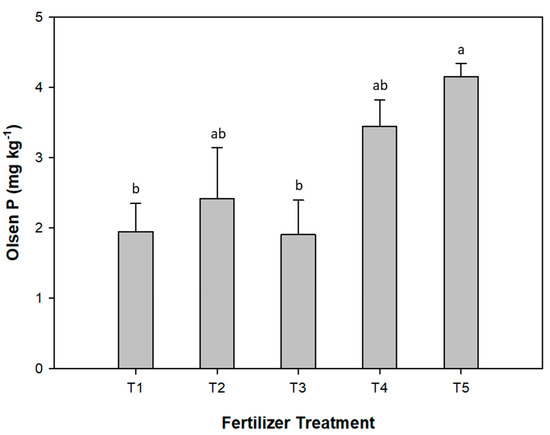 The P availability in soils measured by Olsen P was the highest in T5, followed by T4 (Figure 5). There were no significant differences in Olsen P values between T2, T4, and T5. Treatments T3 and T1 showed the lowest Olsen P values, with no significant differences between them. All five treatments had similar DTPA Fe values (Table 3). The DTPA extractable Fe in the soil was highest in the T2 treatment. However, this was not significantly different from T1. The lowest DTPA Fe was observed in T5.