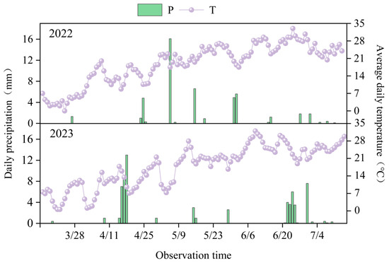 The temperature and precipitation for the spring wheat in 2022 and 2023.