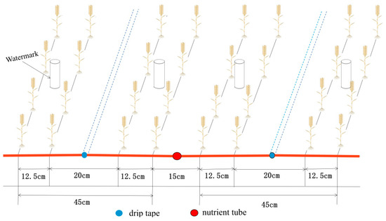 The test plot area was 12 m2. The field plots were planted in a “one tube for four rows” planting system. The nitrogen fertilizer used in the experiment was urea (N = 46%), the phosphorus fertilizer was superphosphate (P2O5 = 12%), and the nitrogen fertilizer base to top dressing ratio was 3:7. A total of 120 kg·ha−1 P2O5 and 255 kg·ha−1 pure N was applied during the growth period. Before this, sowing, plowing, raking and sunning the ground were carried out. Then, we mixed all the phosphorus fertilizers and basal N fertilizers into the soil. The top dressing was applied at 20%, 40%, 35% and 5% along with water through drip-irrigation belts during the tillering, jointing, booting, flowering and filling stages. The plots were buried with a 60 cm deep and 20 cm wide impermeable membrane to prevent water infiltration. According to the pattern of the “one tube for four rows” planting system, we determined the spacing of wheat sowing and the position of the drip-irrigation tape. Then, we determined the position of the watermark (Figure 2). After the preliminary work of sowing was completed, we used a trencher to manually sow seeds and installed the drip-irrigation system (drip-irrigation tape, nutrient tube and fertilizer irrigation) (Figure 2). After the sowing work was completed, we observed the developmental stage of the wheat every day to determine the irrigation time and amount. We planted on 1 April 2022 and 3 April 2023. We harvested on 6 July 2022 and 7 July 2023.