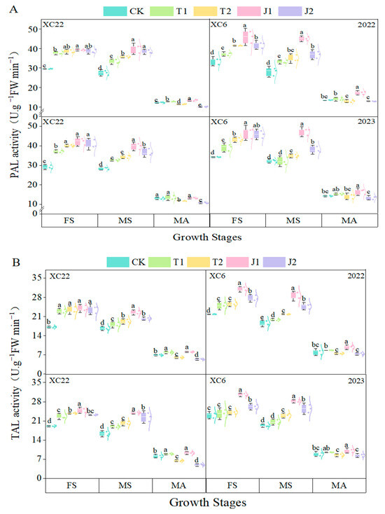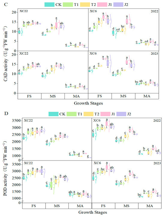 Based on the above analysis, mild drought during the jointing stage (J1) and rehydration was more conducive to the increase and maintenance of PAL, TAL, CAD and POD enzyme activities in the later stages of growth and promoted lignin metabolism. In addition, the interaction between drought treatment and variety had a significant impact on PAL and TAL enzyme activity during the flowering, milk ripening and maturity stages (p < 0.01), CAD enzyme activity during the flowering and milk ripening stages, and POD enzyme activity during the flowering and maturity stages (Table 3).