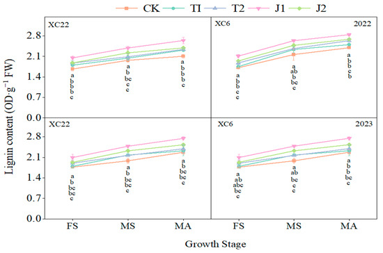 As shown in Figure 4, the lignin content increased with the growth process. Compared with the flowering stage, the lignin content of XC6 increased by 14.62–33.37% and 34.62–45.65%, respectively, in the milk stage and the mature stage. XC22 increased by 11.40–20.22% and 24.88–31.15%. The lignin content was significantly affected by drought stress. Drought treatment can significantly increase the lignin content. Compared with CK, the average increase in the lignin content at the tillering stage and the jointing stage was 2.21–12.00% and 9.19–25.13%, respectively. The lignin content of the two varieties behaved consistently, with J1 > J2 > T2 > T1 > CK. The lignin content of J1 of the two varieties increased by 3.68–23.13% and 6.79–25.45%, respectively, compared with other treatments, and XC6 was 0.75–11.89% higher than XC22. Mild drought during the jointing stage (J1) and rehydration were favorable to the post-flowering lignin content and increased wheat yield. The effect of drought treatment on the lignin content was highly significant (Table 3).