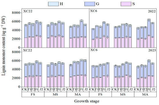As shown in Figure 5, G- and S-type monomers are the main types in the composition of wheat stalk lignin monomers, accounting for the proportions of G at 47.77–55.24% and S at 39.39–47.68% and are significantly higher than the H type (4.42–5.58%). With the advance of the growth process, the content of three kinds of lignin monomers, the proportion of the S-type monomer and the G + S monomers increased. The response of the three monomer contents to drought–rewatering at the different growth stages was the same as lignin. The H, G and S monomer contents of the drought treatments at the tillering stage and the jointing stage, respectively, increased by 0.63–29.45%, 0.21–16.72% and 0.13–20.52%, and 7.95–39.28%, 3.54%–44.64% and 5.45–41.18% compared with the CK treatment. After drought–rewatering, the changes in content among the three monomers were the same. Both for XC6 and XC22, the content variation among the three monomers was consistent, with J1 > J2 > T2 > T1 > CK, and the best performance was achieved under the J1 treatment. Under the J1 treatment of XC6, the average increase of H, G and S monomers was 3.19–39.28%, 2.52%–44.64% and 1.28–41.28% compared with the other treatments. Under the J1 treatment of XC22, the average increase of H, G and S monomers was 1.73–36.85%, 0.27–42.09% and 2.03–25.16% compared with the other treatments. Therefore, mild drought (J1) and rehydration at the jointing stage were more helpful for post-flowering lignin monomer content and promoted lignin synthesis, which, in turn, increased wheat yield and stalk mechanical strength. The effects of drought treatments and cultivars on the lignin monomer content were highly significant (Table 3).