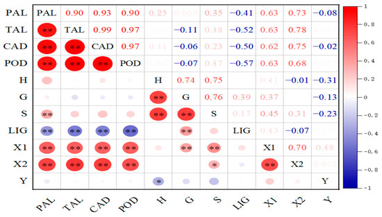 Correlation analyses were made between the SC metabolic parameters; PAL, TAL, CAD and POD enzymes; H, G, and S lignin monomers; total lignin content (LIG); stalk diameter (X1); wall thickness (X2) and yield (Y) in the second internodes of stalks (Figure 6). There was a significant negative correlation between the yield (Y1) and H-type lignin monomer content, indicating that the goal of high yield can be achieved by reducing the H-type lignin monomer content.