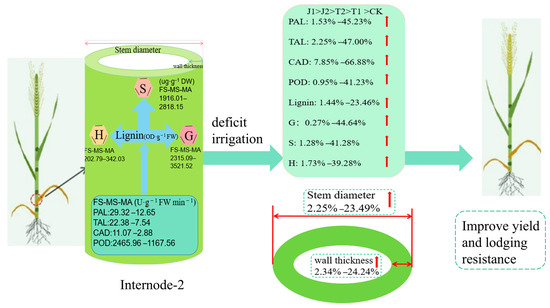 Rational irrigation is the key to ensuring a high yield of wheat. At present, most studies have focused on the effects of the nitrogen application rate and ratio and the water–nitrogen interaction on stalk lignin metabolism and lodging resistance [5,32]. However, there is a lack of systematic research on the regulation of stalk lignin metabolism by drought–rewatering during crop growth. In particular, the relationship between lignin metabolism and stalk lodging resistance in drip-irrigation wheat is not clear. We assume that adaptive deficit irrigation can regulate wheat lignin metabolism to a certain extent and improve stem strength, as well as enhance the physiological function of the basal internodes of spring wheat stalks and ultimately improve the lodging resistance and yield of spring wheat. Therefore, we applied varying levels of drought stress at the tillering and jointing stages of wheat under drip irrigation. We analyzed the characteristics of the accumulation and distribution of lignin in the second internode of stalk bases. Meanwhile, we clarified the changes in lignin and its monomer content regulated by the activities of the key enzymes in lignin metabolism, and we elucidated the intrinsic mechanism of lignin metabolism that regulates stalk strength and yield formation. This paper provides a theoretical basis for exploring the water-saving potential, high-yield, stable-yield, and stress-resilient cultivation of drip-irrigated wheat in arid regions.
