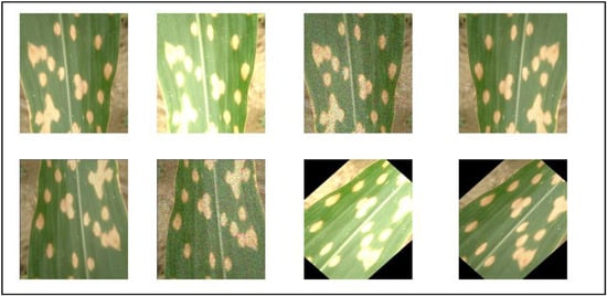 In real-world environments, the collected image datasets may be influenced by factors such as weather, lighting, and dust. Therefore, aligning with real-world conditions can further enhance the robustness and generalization capabilities of the model. The sample size of the aforementioned dataset is small, which is insufficient to support effective training and evaluation of deep learning models. To address the issue of limited sample size, this paper employs data augmentation techniques including random transformations, adjustments of image brightness and contrast, addition of noise, and translation. Random rotation increases the diversity of samples, simulating the scenario where the same sample is captured from different angles, thereby enabling the model to learn that disease features can still be recognized from varying viewpoints. Adjustments in brightness simulate actual lighting variations, enhancing the model’s accuracy in real-world applications and emphasizing feature saliency. Adding noise improves the model’s robustness, making it more resilient to noise and reducing its dependence on neat data. The employed augmentation techniques are designed to produce a broader spectrum of image samples, thereby enhancing the model’s robustness and precision across various environmental conditions. Following this, the image dimensions were altered to a resolution of 512 × 512 pixels. This procedure culminated in an experimental dataset comprising 20,897 images, which constitutes the corn leaf blight dataset, hereinafter referred to as the CLB dataset. Figure 4 displays some of the augmentation results, and Table 1 shows the data distribution.