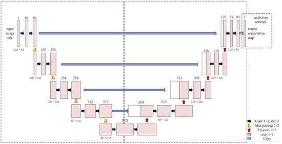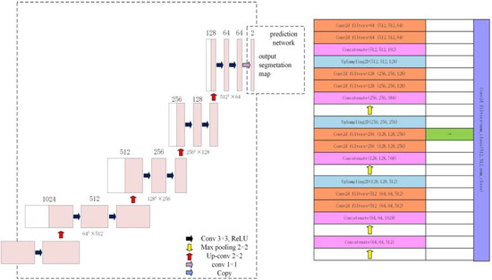 The U-Net architecture, as shown in Figure 5, constitutes a neural network model that integrates an encoder-decoder framework. The encoder segment is configured with a convolutional neural network (CNN) structure, functioning as a contracting path dedicated to feature extraction and the decrement of resolution [23]. The contracting path of the architecture consists of four distinct sub-blocks, each of which includes a sequence of two consecutive 3 × 3 convolutional layers, followed by a rectified linear unit (ReLU) activation function, and culminates in a max pooling layer, which serves to downsample the feature maps. The consecutive 3 × 3 convolutional layers are instrumental in diminishing the complexity of the neural network while preserving the integrity of the segmentation accuracy. Throughout the downsampling process, the feature channel count is incremented by a factor of two. The decoder segment of the network is architected with convolutional blocks that integrate upsampling mechanisms, thereby constituting an expansive pathway dedicated to the restitution of image detail, the delineation of segmentation object contours, and the gradual restoration of the spatial resolution within the feature maps. Within this expansive pathway, each sub-block is comprised of two successive 3 × 3 convolutional layers, a RelU activation function, and a transposed convolutional layer, which is responsible for the upsampling process. Upsampling serves to amplify the feature maps to twice their original dimensions and to reclaim the lost detail information. A distinctive attribute of the U-Net is the implementation of cropping, which facilitates the concatenation of low-level detail features, captured during downsampling with high-level semantic features, extracted during upsampling, at corresponding layers. The final output of the segmentation procedure is augmented through the concatenation of object category recognition, which is inferred from low-resolution data, and the accurate localization segmentation provided by high-resolution features. This integration effectively addresses the challenge of information loss during the upsampling stage, thereby enhancing the precision of the segmentation outcomes.