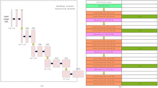 In this study, the U-Net architecture serves as the foundational framework for model development, with the convolutional and max pooling layers derived from the VGG19 network constituting the encoder segment of the U-Net architecture. The objective of this integration is to augment the efficacy and precision of image feature extraction, thereby refining the semantic segmentation capabilities of the U-Net model and mitigating the influence of extraneous factors on the model’s interpretive accuracy. The component of the backbone network responsible for feature extraction is illustrated in Figure 7.