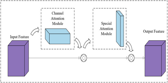 In the year 2018, an attention mechanism termed the convolutional block attention module (CBAM) was introduced by researchers for application within convolutional neural network modules. This mechanism amalgamates channel-wise attention with spatial attention modules. It operates by calculating attention weights across both the spatial and channel dimensions within the intermediate feature maps of deep learning models. These computed weights are subsequently multiplied with the original feature maps to effect an adaptive refinement of the features. The CBAM module is designed to be incrementally integrated into established architectures, including VGG 19, ResNet [24], and MobileNet [25]. The configuration of the CBAM module is depicted in Figure 8.