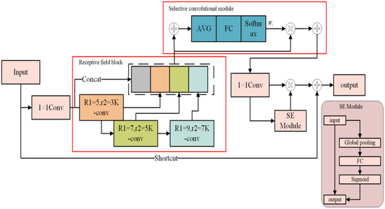 During the expansion of the receptive field and the aggregation of contextual information in semantic segmentation networks, pooling operations frequently result in the erosion of positional and dense semantic details. Nevertheless, the receptive field block (RFB) design mitigates the reliance on parameters and computational complexity, whilst preserving the integrity of image resolution. The architecture of the RFB is delineated in Figure 11. It successfully broadens the effective receptive field of the convolutional kernel using a reduced number of parameters and effectively integrates contextual information [23]. The architecture of the network is outlined as follows. Initially, a dimensionality reduction is performed on the input feature map via a 1 × 1 convolution, subsequent to which the feature map is processed in a sequential manner through three K-convolutions with distinct expansion ratios. The outputs from these four convolutional layers are concatenated along the channel axis, yielding a feature map that possesses an extensively enriched receptive field. Subsequently, the feature map with the enhanced receptive field acquires channel-wise weights via a selective convolutional module. These weights are utilized to compute the feature map, thereby effecting an adaptive modification of the receptive field dimensions. Following this, a 1 × 1 convolution is applied to revert the processed feature map to the original number of channels, which is then refined by the squeeze-and-excitation (SE) module. Conclusively, the refined feature map is integrated with the original feature map through a skip connection.