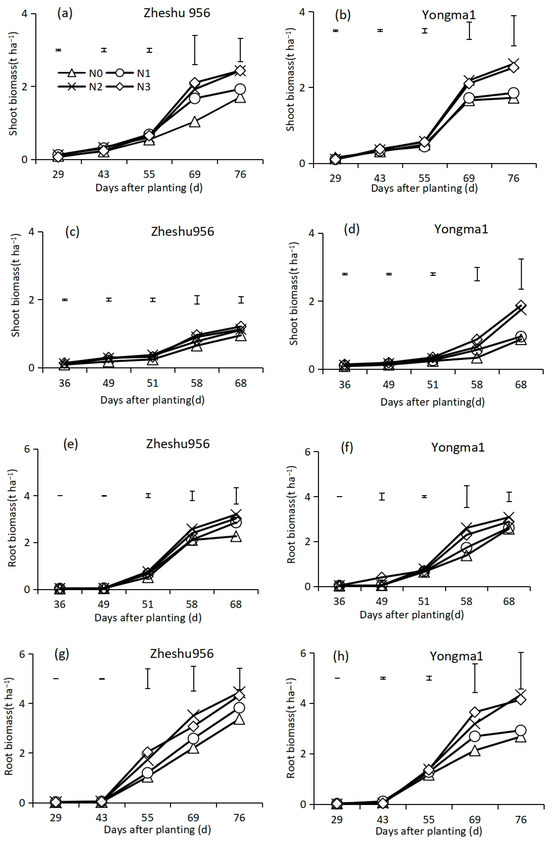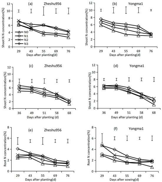 Changes in shoot nitrogen concentration of Zheshu956 (a) and Yongma1 (b) in spring 2022 and Zheshu956 (c) and Yongma1 (d) in autumn 2022; changes in root nitrogen concentration of Zheshu956 (e) and Yongma1 (f) in spring 2022 and Zheshu956 (g) and Yongma1 (h) in autumn 2022; changes in the whole-plant nitrogen concentration of Zheshu956 (i) and Yongma1 (j) in spring 2022 and Zheshu956 (k) and Yongma1 (l) in autumn 2022. Vertical lines represent the LSD values (p < 0.05) at each sampling date.