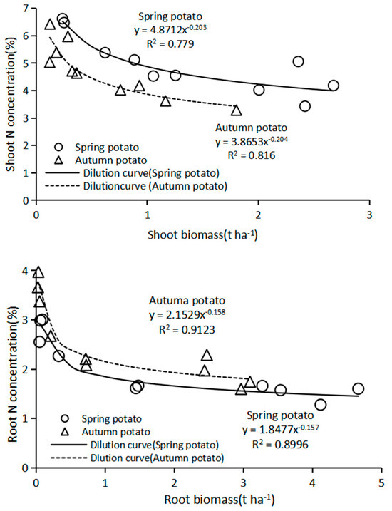 The diagnosis of nitrogen nutrition in potatoes is of great significance for their fertilizer management. We constructed the critical nitrogen concentration dilution curve of spring and autumn potatoes for N diagnosis. The shoot, root, and whole-plant diluted nitrogen curve models of spring and autumn potatoes were different. For the shoot and the whole-plant nitrogen dilution curves, the spring potato curve model has a higher a value and a smaller b value than that of the autumn potato, resulting in a higher nitrogen concentration. The critical nitrogen concentration dilution curve based on the whole plant was determined to be more appropriate for tuber crops like potatoes. Furthermore, it is evident that NNI can be used to determine the amount of nitrogen that potatoes require. At N2(160 kg ha−1) level, both varieties achieved the maximum yield. The results of this study showed that the critical nitrogen concentration dilution curve model established in this experiment can be better applied to the diagnosis of the growth nitrogen requirement of spring and autumn potatoes. After two years of field experiments, we analyzed the influence of temperature and sunshine duration on the critical nitrogen concentration curve of potatoes in spring and autumn. However, in real life, two seasons also include other factors, so further supplementary verification is needed.