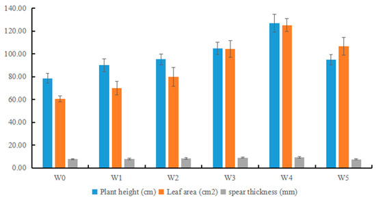 The amount of P2O5 applied to different treatments was 0 kg/hm2 (W0), 112.5 kg/hm2 (W1), 225.0 kg/hm2 (W2), 337.5 kg/hm2 (W3), 450.0 kg/hm2 (W4), and 562.5 kg/hm2 (W5), respectively. Samples were taken from the filling stage leaves of the quinoa plants 15 days after the flowering (repeated three times) to determine the plant height, leaf area, stem thickness, and other morphological indicators. At this time, the most significant morphological and phenotypic differences in the quinoa plants were evident. Among them, W0 exhibited the shortest plant height, while W4 possessed the tallest height; however, W5 exhibited a lower plant height than W4. Overall, this indicated that as the phosphorus content increased, the height of the quinoa plants increased; however, excessive-phosphorus application led to a downward trend in quinoa plant height. This same trend was observed for leaf area and stem thickness. Notably, the leaf area, plant height, and stem diameter of quinoa under different phosphorus fertilizer treatments were higher in the W4 group than those in all other groups, indicating that the W4 phosphorus fertilizer concentration may be the most suitable phosphorus fertilizer concentration for quinoa growth (Figure 1).