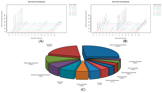We accurately weighed 200 mg (±1%) of the sample and subjected it to vacuum freeze drying (Scientz-100F). We accurately added 0.6 mL of methanol (including internal standard) (Table S1), added 100 mg of glass beads, and vortexed for 1 min. Grinding was performed at 50 Hz for 60 s in a high-throughput tissue grinder and repeated twice. Room temperature ultrasound was conducted for 15 min. We centrifuged at 12,000 rpm and 4 °C for 10 min, took a 200 µL supernatant, and added it to the detector bottle. The detector bottle was a 2 mL brown injection bottle, which was used to contain the extract to be measured and injected into the liquid phase injection tray. Quality control (QC) samples were used to correct for deviations in the analytical results of the mixed samples and for errors due to the analytical instrument itself. In total, 20 µL of each sample to be tested was mixed into a QC sample. Chromatographic separation was used with an ACQUITY UPLC® HSS T3 (150 × 2.1 mm, 1.8 µm, Waters, Milford, MA, USA) column maintained at 40 °C. The temperature of the autosampler was 8 °C. The gradient elution of analytes was carried out with 5 mM ammonium formate (Brand: sigma, Darmstadt, Germany) in water (A) and acetonitrile (B) at a flow rate of 0.25 mL/min or 0.1% formic acid (Brand: TCI) in water (C) and 0.1% formic acid in acetonitrile (Brand: Thermo Fisher, Waltham, MA, USA) (D). The injection of 2 μL of each sample was performed after equilibration. An increasing linear gradient of solvent B (v/v) was used as follows: 0–1 min, 2% B/D; 1–9 min, 2–50% B/D; 9–12 min, 50–98% B/D; 12–13.5 min, 98% B/D; 13.5–14 min, 98–2% B/D; and 14–20 min, 2% D-positive model (14–17 min, 2% B-negative model). The mass spectrometer instrument used an electrospray ionization source (ESI) in positive and negative ion ionization modes with 3.50 kV for positive ion sprays and 2.50 kV for negative ion sprays (the correction fluid model: thermoA39239). Sheath gas and auxiliary gas were set at 30 and 10 arbitrary units, respectively. The capillary temperature was 325 °C. The analyzer scanned over a mass range of m/z 81–1000 for a full scan at a mass resolution of 60,000. Data-dependent acquisition (DDA) MS/MS experiments were performed with a High-Energy Collisional Dissociation (HCD) scan. HCD breaks up molecules by means of high-energy collisions, resulting in the production of fragment ions, which are subsequently detected and analyzed by a mass spectrometer. The normalized collision energy was 30 eV. Dynamic exclusion was implemented to remove some unnecessary information in MS/MS spectra.